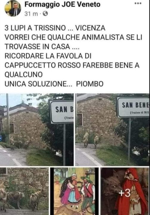 Si trattava, insomma, di tre cuccioli di cane lupo cecoslovacco, sfuggiti a un allevatore, scambiati per lupi e le cui foto erano diventate virali sui social. In particolare, a rilanciarle era stato il consigliere regionale veneto di Fratelli d’Italia Joe Formaggio, denunciato il 22 agosto dagli animalisti dell’Associazione Italiana Difesa Animali ed Ambiente (il post, vista la cantonata presa e le comunicazioni del sindaco, era stato poi cancellato). Formaggio inneggiava a sparare ai lupi, accompagnando le foto dell’apparizione a Trissino con ritratti di Cappuccetto Rosso e le frasi “Vorrei che qualche animalista se li trovasse in casa. Ricordare la favola di Cappuccetto Rosso farebbe bene a qualcuno. Unica soluzione: piombo”.