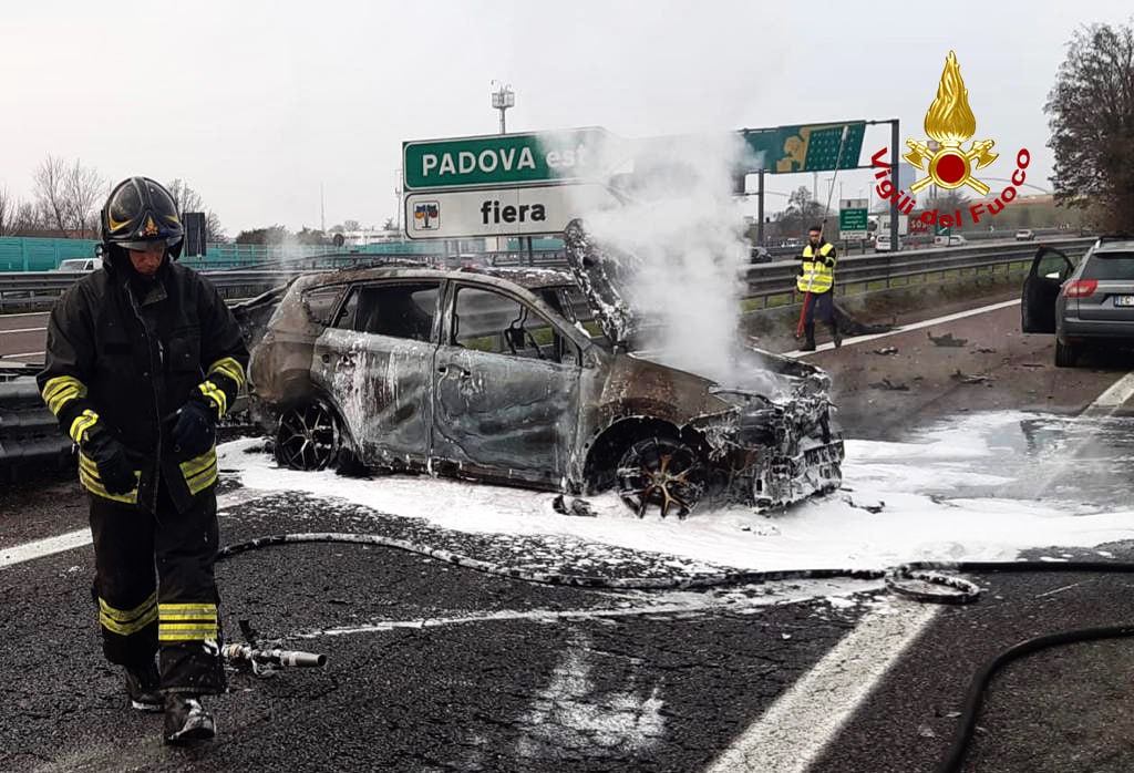 A4, schianto fra due auto a Padova Est: tre feriti e un veicolo incenerito
