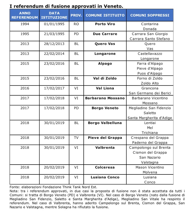 Eppure, nonostante la convenienza economica, oltre la metà delle proposte di fusione in Veneto è stata finora respinta: ben 15 su 29 hanno fallito il test del referendum. Sono 14, invece, quelle portate a termine con successo: cinque in provincia di Vicenza e di Belluno, due nel Padovano, una nel Trevigiano e nel Rodigino. In provincia di Verona tutti e tre i referendum sono stati bocciati, mentre nel Veneziano non si è tenuta alcuna consultazione.