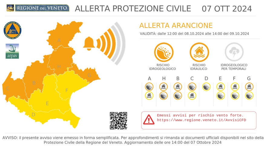 Il Centro Funzionale Decentrato della Protezione Civile del Veneto, alla luce delle previsioni meteo avverse a partire da domattina, ha emesso un avviso di criticità idrogeologica e idraulica, valido dalle ore 12 di martedì 8 ottobre alle 14 di mercoledì 9 ottobre.