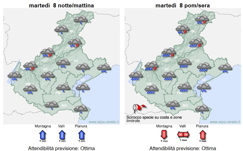 Le previsioni meteo indicano nella giornata di martedì passaggio di un intenso impulso perturbato di stampo sciroccale con fase più significativa nella seconda parte della giornata. Sono previste precipitazioni in estensione e intensificazione nel corso della mattinata fino a diventare estese e persistenti sulle zone montane e pedemontane con rovesci anche forti e locali temporali e quantitativi abbondanti o localmente molto abbondanti specie su zone Prealpine e Dolomiti meridionali; sulla pianura previste precipitazioni sparse o a tratti diffuse, via via meno consistenti da nord a sud con probabili rovesci e temporali nel pomeriggio/sera. Rinforzi di vento dai quadranti meridionali, anche forti sulla costa nel pomeriggio/sera.