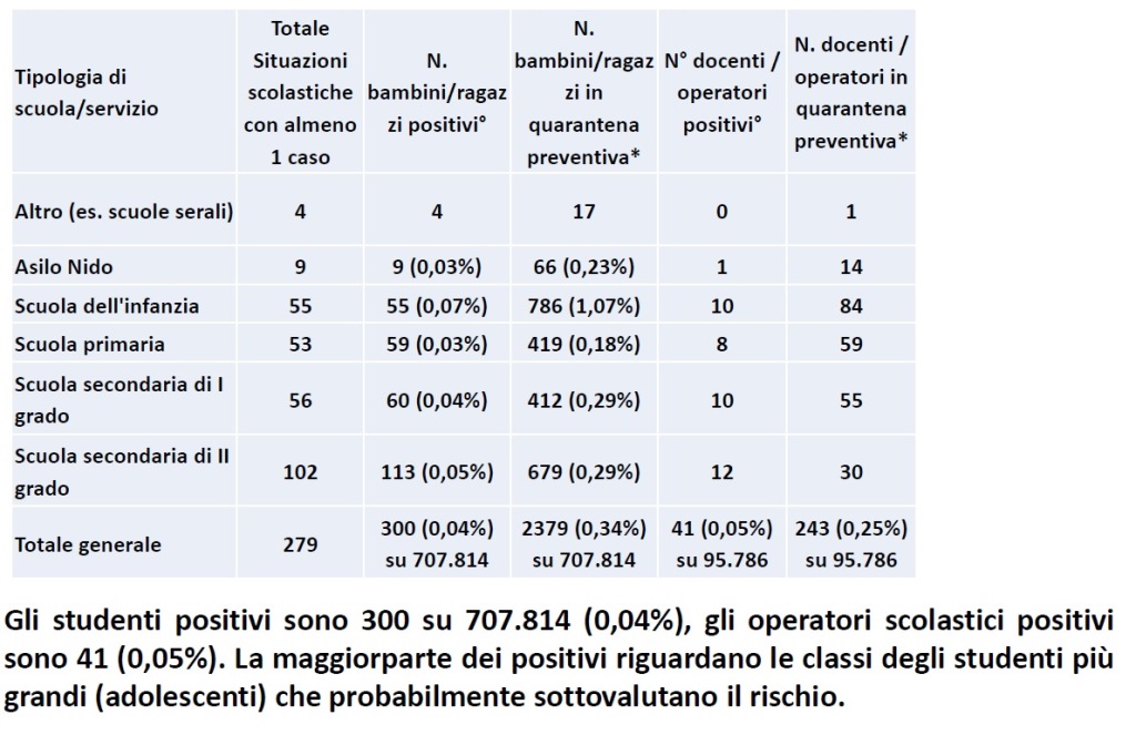 Lo studio comprende anche un aggiornamento della situazione delle scuole; all’8 ottobre 279 scuole presentavano almeno un caso. Gli studenti positivi erano 300 su un totale di 707.814, pari allo 0,04%. 2.379 quelli in quarantena preventiva, pari allo 0,34%. Il numero di docenti e operatori positivi era di 41 su un totale di 95.786, pari allo 0,05%; quelli in quarantena preventiva erano 243, pari allo 0,25%.