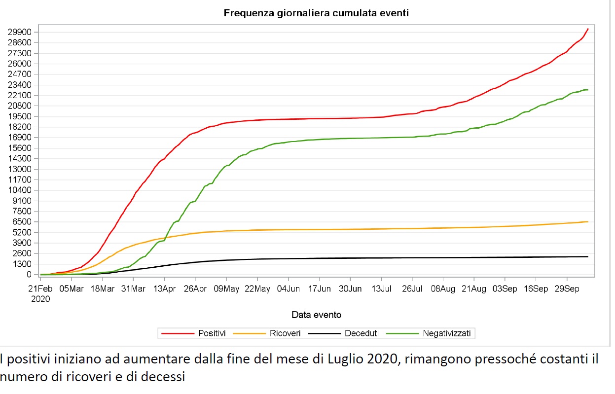 Lo conferma uno studio della situazione epidemiologica effettuato dalla Direzione Prevenzione sulla situazione epidemiologica (aggiornato al 9 ottobre), da quale emerge che le positività, a partire dalla fine di luglio, sono progressivamente tornate ai livelli di marzo, ma rispetto ad allora i ricoveri ospedalieri presentano numeri infinitesimali (325 persone, delle quali 231 positive contro le svariate centinaia di marzo; solo 29 ricoverati in terapia intensiva, dei quali nove già negativizzati).