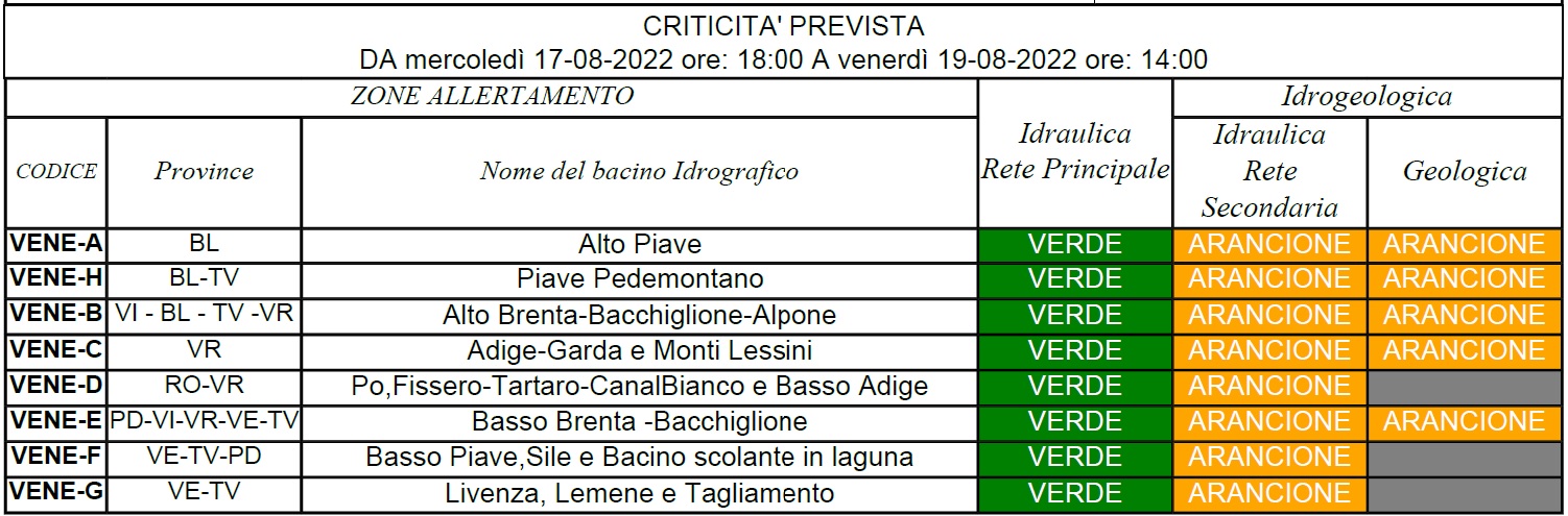 Possibile fase più significativa tra il tardo-pomeriggio sera di giovedì e il primo mattino di venerdì. Dalle ore 18 alle ore 24 del 17 agosto la criticità è da considerarsi gialla per le sole zone Alto Piave, Alto Brenta-Bacchiglione-Alpone, Adige-Garda e Monti Lessini, e Po, Fissero-Tartaro-CanalBianco e Basso Adige, assente altrove.