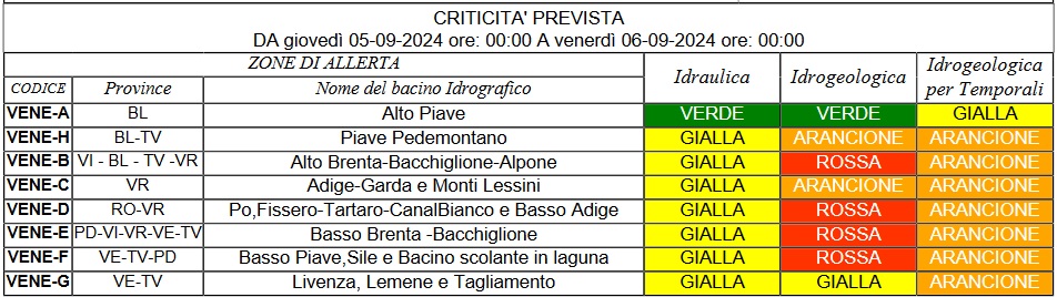 Fra la mezzanotte di questa sera (mercoledì 4 settembre) e le 8 di domani mattina 5 settembre la criticità idrogeologica per temporali è gialla su tutto il territorio regionale; la criticità idrogeologica è gialla in tutte le zone di allertamento tranne sulla zona di allerta Vene-A (Alto Piave) dove è verde.