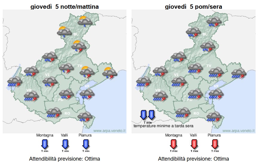 Le precipitazioni potranno interessare la regione già dalle prime ore di domani sulle zone occidentali e meridionali. Nel corso della mattinata tenderanno ad estendersi ed intensificarsi: il tempo sarà in prevalenza perturbato con precipitazioni estese, anche a carattere di rovescio e temporale, in genere più significative dalla mattinata. I fenomeni più consistenti sono previsti sulle Prealpi e su pianura e costa: in queste zone saranno probabili temporali anche intensi (forti rovesci, locali grandinate, forti raffiche di vento), che localmente potranno risultare anche piuttosto persistenti, dando origine localmente ad abbondanti quantitativi di pioggia. Nelle prime ore di venerdì i fenomeni tenderanno a cessare sulle zone occidentali e ad attenuarsi e diradarsi su quelle orientali.