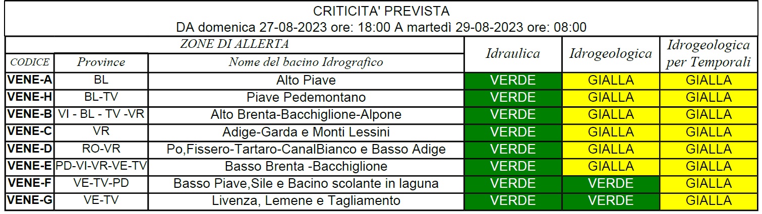 E’ stata dichiarata oggi una nuova allerta gialla per criticità idrogeologica per temporali su tutto il territorio veneto. E’ stata emessa dal Centro Funzionale Decentrato della Regione a