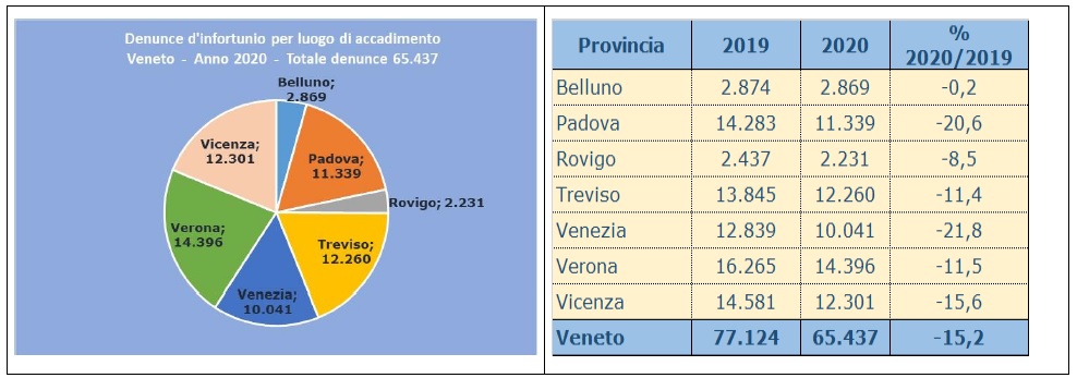 Nel 2020 in Veneto sono stati denunciati all’Inail 65.437 infortuni sul lavoro, il 15% in meno rispetto al 2019 (77.124 denunce). I casi mortali sono stati 86, 12 in meno rispetto al 2019. A rilevarlo sono le elaborazioni dello stesso Istuto Nazionale per gli Infortuni sul Lavoro.⁸