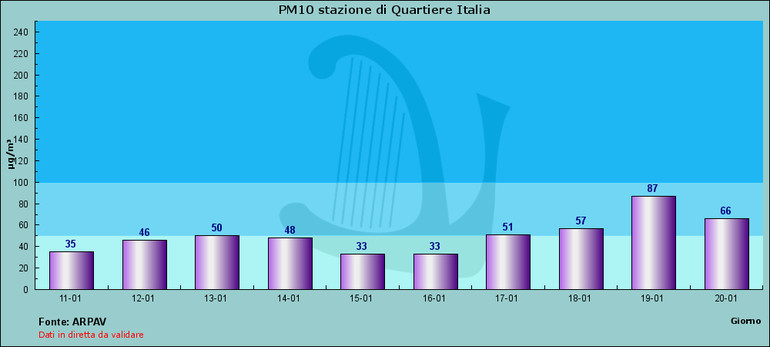 Lo conferma Arpav, l’Agenzia Regione per la Prevenzione e Protezione Ambientale in Veneto, che spiega come siano stati effettivamente raggiunti i quattro superamenti consecutivi del valore limite giornaliero a Treviso (punto di rilevamento di via Lancieri), Venezia (parco Bissuola), Padova (zona Mandria), Vicenza (Quartiere Italia), Este, Rovigo Centro, Castelfranco Veneto, Bassano del Grappa, Cittadella, Piove di Sacco, San Donà di Piave e Mirano. La concentrazione più elevata è stata registrata ieri a Venezia Parco Bissuola, con 100 µg/m3 (microgrammo, ossia millionesimo di un grammo, per metro cubo d’aria analizzata), ma i valori si sono mantenuti ben al di sopra dei 50 µg/m3 in tutte le stazioni della rete, tranne in quelle situate nell’area montana e pedemontana.