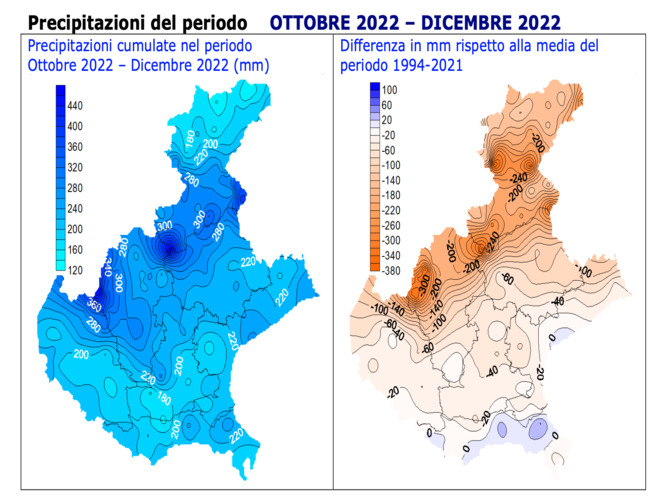 Sul Veneto fra ottobre e dicembre sono caduti mediamente 236 mm di precipitazioni, a fronte di una media, nel periodo 1994-2021, di 328 millimetri. Gli apporti del periodo sono inferiori alla media (-28%) e sono stimati in circa 3337 milioni di metri cubi.
