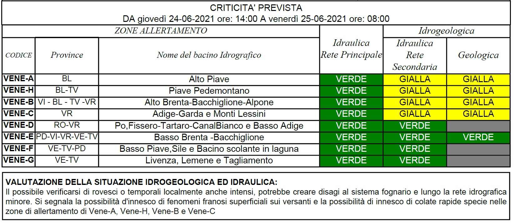 Alla luce dei fenomeni meteorologici previsti, è confermato quindi lo stato di attenzione per criticità idrogeologica (riferita allo scenario per temporali forti) per i disagi che potrebbero verificarsi nel sistema di drenaggio urbano e lungo la rete idrografica minore. Lo stato di attenzione è valido per la rete secondaria dei bacini idrografici dell’Alto Piave, del Piave Pedemontano, dell’Alto Brenta-Bacchiglione-Alpone e Adige-Garda-Monti Lessini fino alle ore 8 di domani 25 giugno.