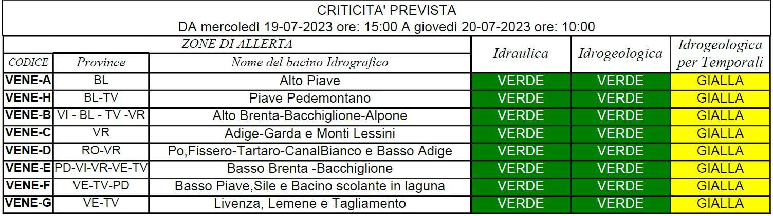 E’ scattata alle 15 di oggi, mercoledì 19 luglio, una nuova allerta gialla per criticità idrogeologica e idraulica per forti temporali su tutto il territorio veneto, emessa dal Centro Funzionale Decentrato della Regione a partire dalle ore 15 di oggi e fino alle ore 10 di domani, giovedì 20 luglio.