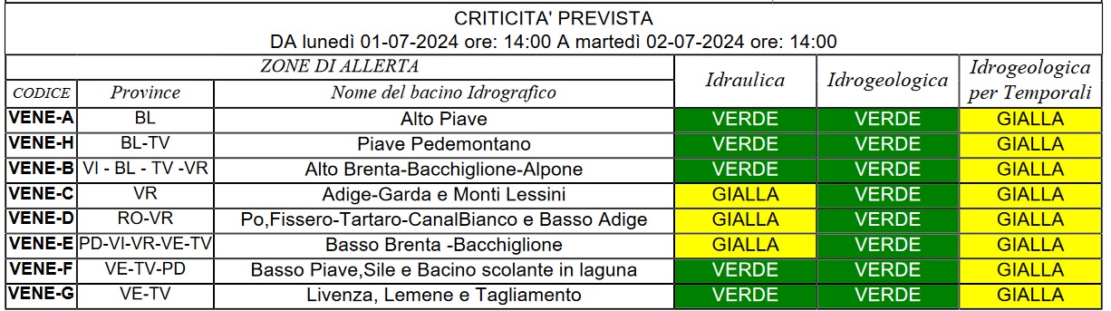 Alla luce di queste previsioni, il Centro Funzionale Decentrato della Protezione Civile del Veneto ha emesso un avviso di criticità idraulica e idrogeologica valido dalle 14 di oggi 1° luglio alle 14 di domani.