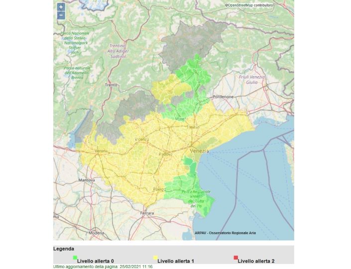 Per questo, da domani 26 febbraio e almeno fino a tutta la giornata del 1 marzo, sarà in vigore il livello di allerta 1 per il particolato Pm10 (colore arancio) nei capoluoghi di Treviso, Padova, Vicenza e Verona; nonché nelle aree di Castelfranco Veneto, Mansuè, Mirano, Rovigo, Badia Polesine, Este, Cinto Euganeo, Monselice, Piove di Sacco, Cittadella, Bassano, Schio, Legnago e San Bonifacio. Saranno invece in allerta 0 per il particolato Pm10 (colore verde) l’Agglomerato di Venezia, le aree di Belluno, Feltre, Adria, Conegliano, Chioggia, San Donà di Piave.