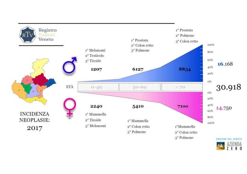 Fra il 2013 e il 2017 in Veneto sono stati diagnosticati 30.918 nuovi casi di tumore maligno (16.168 nei maschi e 14.750 nelle femmine), con una modesta (ma benvenuta) riduzione rispetto ai 31.688 registrati nel 2016. Le sedi maggiormente colpite nelle donne sono mammella, colon-retto, polmone e utero. I tumori più frequenti negli uomini sono quelli della prostata, colon-retto, polmone e vescica.