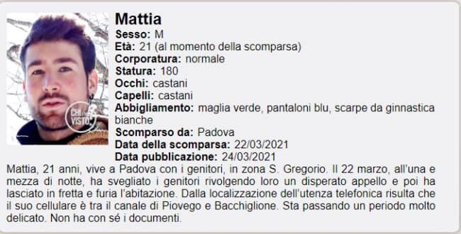 Il suo telefono cellulare è muto, dopo gli ultimi segnali agganciati nella città del Santo nella notte di lunedì scorso. Non avrebbe con sè alcun documento ma solo lo smartphone, dopo aver lasciato la sua camera in fretta e furia. Del suo caso di sparizione improvvisa si è occupato mercoledì sera la trasmissione televisiva Rai “Chi l’ha visto?”, fornendo alcuni contatti utili in caso di riconoscimento di Mattia da qualche parte. In caso di avvistamento, si prega di contattare immediatamente i carabinieri locali o il numero 3477.848025.