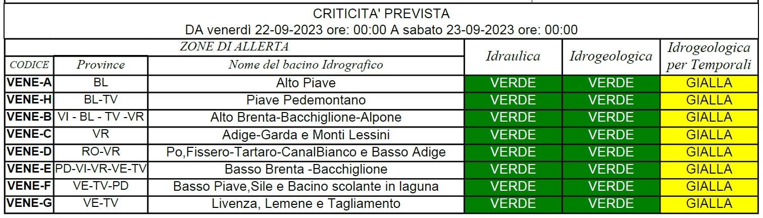 dichiarata la fase operativa di “Attenzione” (Gialla) dalla mezzanotte di giovedì 21 settembre alla mezzanotte di venerdì 22, in tutti i bacini idrografici del Veneto.