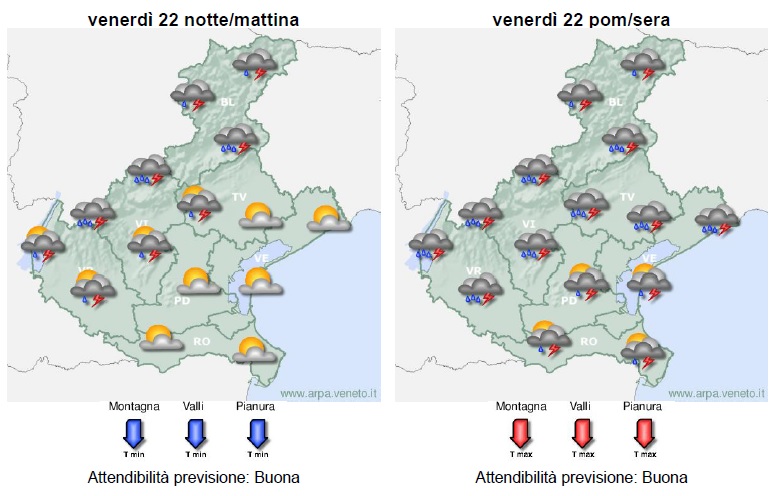 Correnti sudoccidentali associate ad una vasta saccatura di origine atlantica determineranno estesi annuvolamenti e precipitazioni diffuse venerdì, più consistenti sulle zone centro-settentrionali. Sabato la saccatura si approfondirà sull’Italia centrale, convogliando sul Veneto correnti orientali, che potranno dar luogo a precipitazioni anche a carattere di rovescio o temporale, fino alle prime ore di domenica. Dal pomeriggio di domenica crescente stabilità.