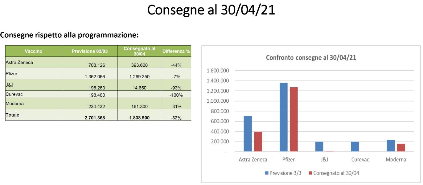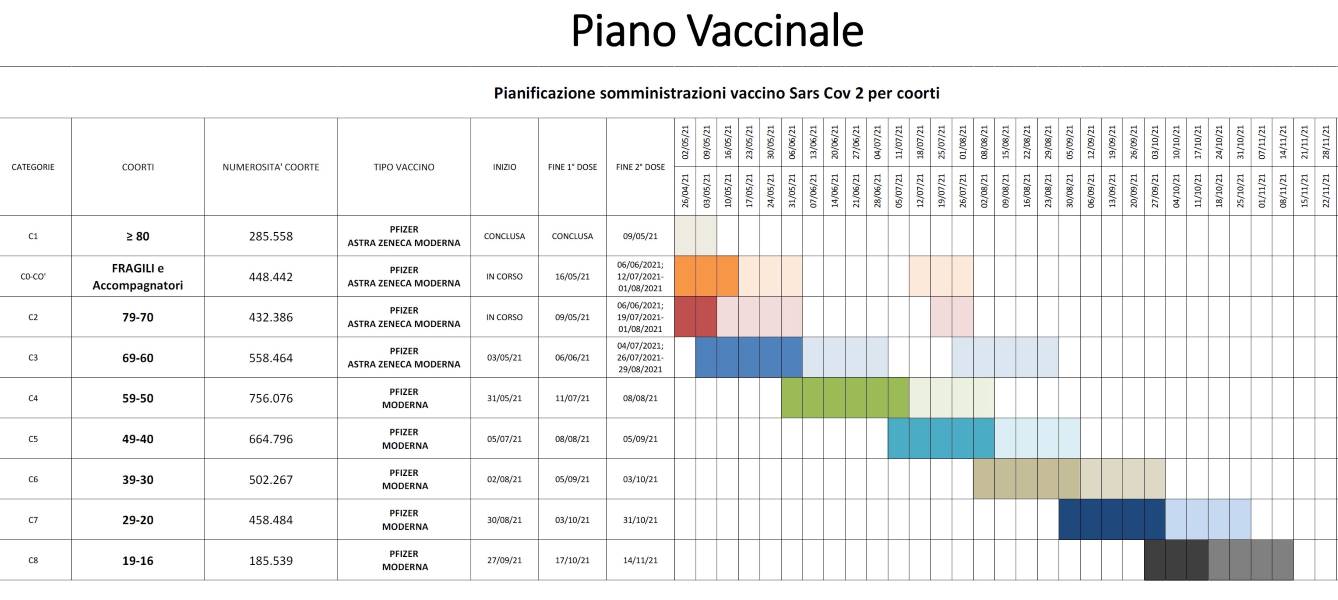 Il Piano della Regione si basa sulle previsioni di fornitura dei vaccini Pfizer, Moderna e AstraZeneca annunciate dal piano nazionale del 3 marzo scorso (Johnson&Johnson per il momento viene tenuto a parte per compensare eventuali carenze contrattuali delle altre case farmaceutiche).