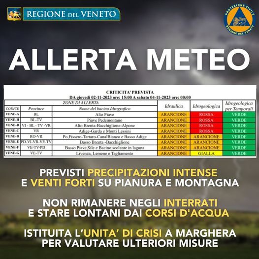 Il Centro Funzionale Decentrato della Protezione Civile regionale ha dichiarato, per criticità idrogeologica, la fase operativa di “Allarme” (Rossa) dalle 14 di oggi 2 novembre fino alle 00 del 4 novembre nei bacini idrografici VENE-A Alto Piave (BL), VENE H Piave Pedemontano (BL – TV), VENE B Alto Brenta-Bacchiglione-Alpone (VI – BL – TV–VR), VENE-C Adige-Garda e Monti Lessini (VR). Per la stessa criticità e negli stessi orari e stata dichiarata la fase operativa di “Preallarme” (Arancione) nei restanti bacini.