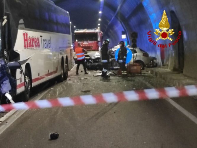 Violento frontale pullman-auto in galleria ad Arsiè: grave coppia estratta dalle lamiere