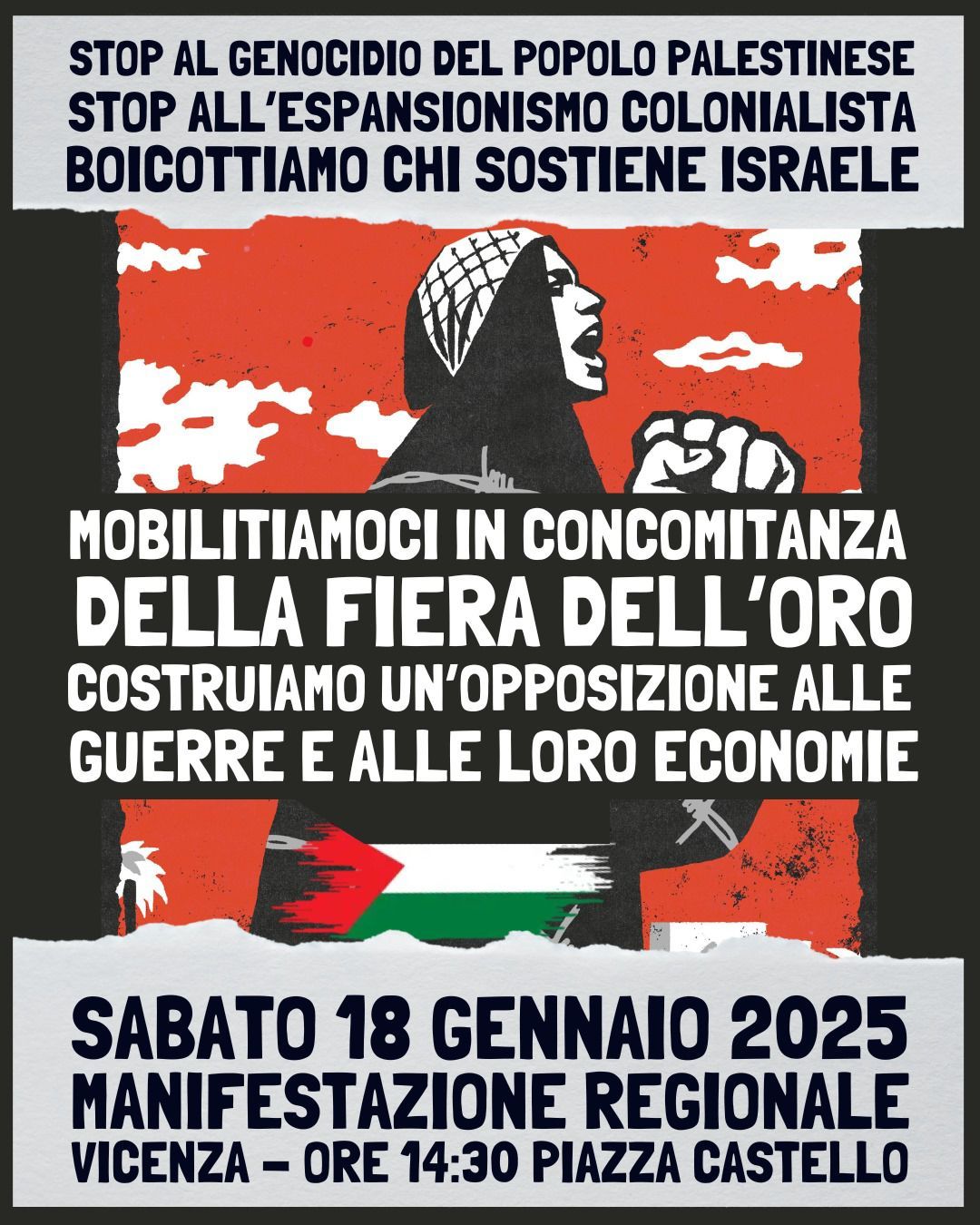 Il raduno è previsto per le 14,30 in piazza Castello a Vicenza: l’appello, spiegano gli organizzatori, “è frutto di un percorso di realtà vicentine che si sono trovate nelle ultime settimane per dare vita a una mobilitazione plurale durante la fiera dell’oro”. A promuovere la manifestazione sono 29 realtà della provincia di Vicenza dell’area antagonista e pacifista. Oltre venti le sigle che hanno aderito al loro appello.