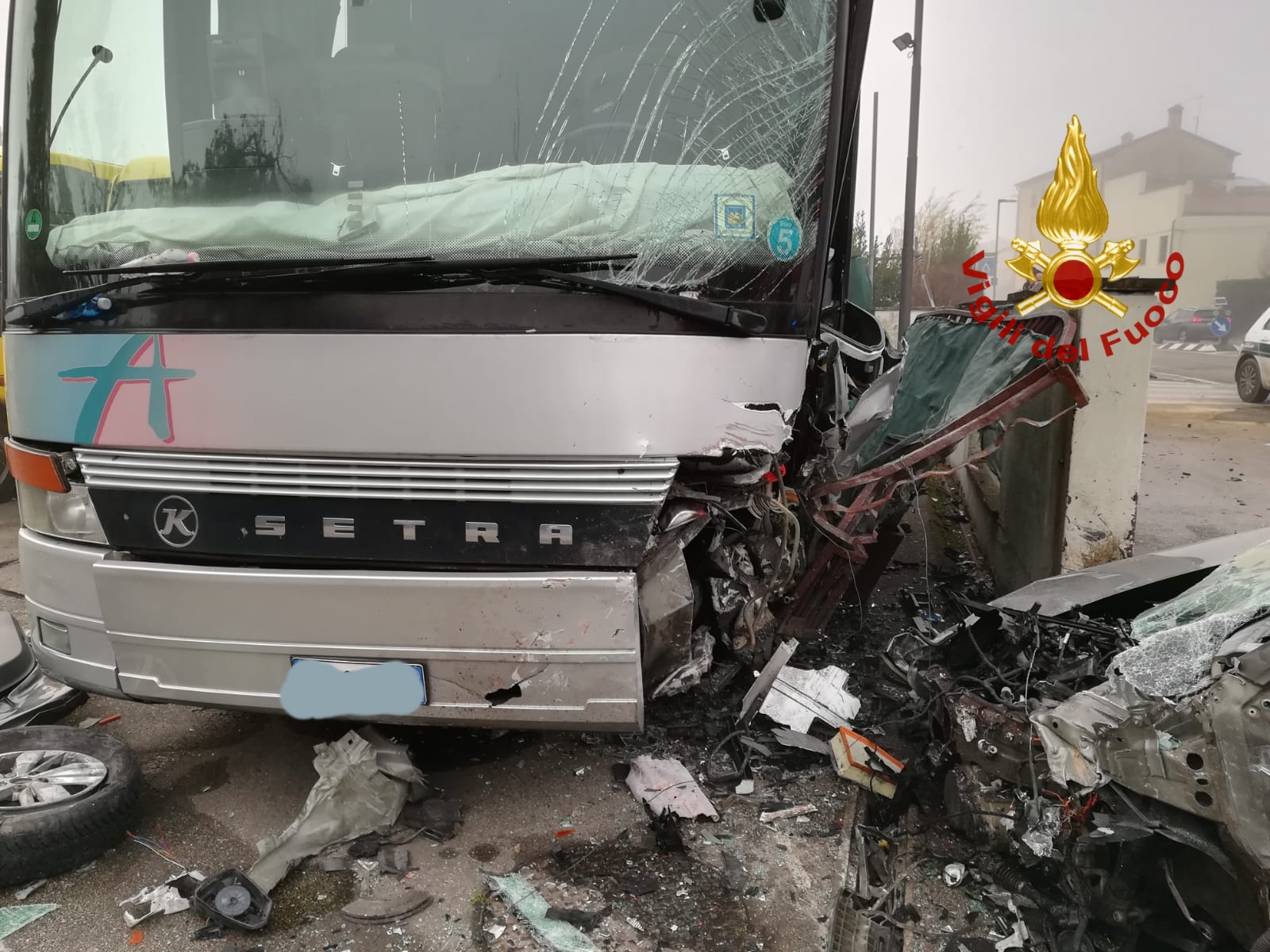 Auto esce di strada e centra pullman in sosta. Miracolato il conducente