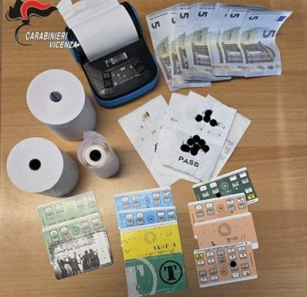 Si arriva così a questo mercoledì, 21 gennaio, quando a conclusione delle indagini i militari dell’Arma, in esecuzione di un decreto di perquisizione del magistrato titolare dell’inchiesta, hanno effettuato perquisizioni personali e domiciliari nei confronti di altri due giovani italiani: M.A., 18enne di Creazzo, e F.G., 24enne di Grumolo delle Abbadesse. Si tratta delle due persone ora accusate di aver materialmente contraffatto le drink card usati per le truffe. Nel corso della perquisizione a carico del 18enne di Creazzo, i carabinieri hanno anche trovato, sepolto in un bosco in collina, il materiale usato per le contraffazioni, tra cui una stampante, carta termica in rotoli, tessere “drink card” di diversi locali e 23 banconote false da cinque euro. Presso l’abitazione del 24enne di Grumolo, invece, sono state rinvenute 11 “drink card” usate di vari locali, un computer portatile e un tablet.