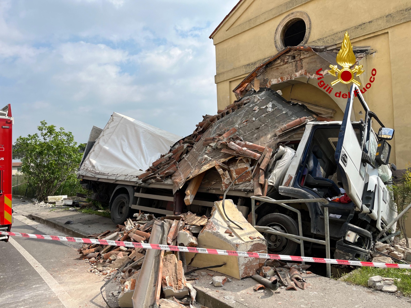 Camion fuori strada a Polegge: abbattuto il portico di una chiesetta, due feriti