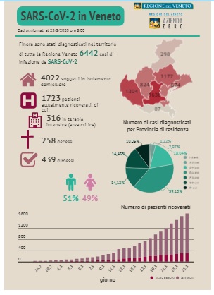 Uno sguardo infine ai dati Veneti (bollettino della Regione del  25 marzo, ore 17): 6582 i contagiati (+140), 17.159 le persone in isolamento domiciliare (positivi+contati). 273 le persone decedute (+36 nelle ultime 24 ore), 1754 i ricoverati (+114 rispetto a ieri sera), dei quali 318 in terapia intensiva (+4). 485 i dimessi (+71). (Qui i report infografici della Regione Veneto).