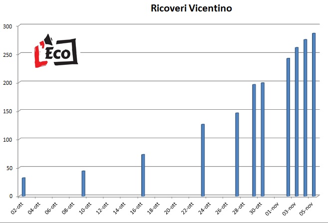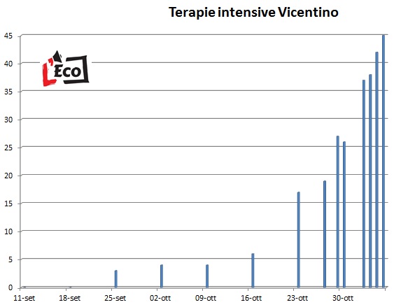 In ogni caso, mente nel report regionale di lunedì gli “attualmente positivi” in terra berica erano 6.198, questa mattina alle 8 risultavano 7.639: la massa dei contagi attivi è cresciuta quindi di 1.441 unità, ossia del 23% (di quasi un quarto in soli tre giorni). Se poi si guardano i nuovi contagi, stando ai dati delle due Ulss si è passati in una settimana da 8.392 a 11.663 (da inizio epidemia): 3.271 nuovi casi in una settimana (+39%). Negli ultimi sette giorni si sono registrati anche 33 morti, mentre la presenza di positivi nelle terapie intensive (Santorso e Vicenza) passa da 27 a 45 (+66%). 286 le persone ricoverate nel vicentino: erano 196 una settimana fa (+46%).