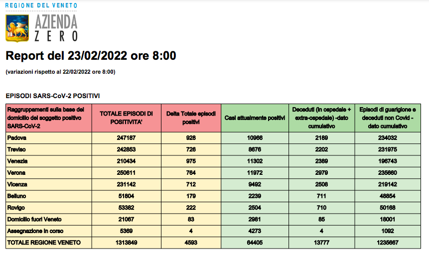 Anche in Veneto scende il numero dei contagi. Il bollettino di oggi riferisce di 4.593 nuovi positivi nelle ultime 24 ore, per un totale di 1.313.849 dall’inizio della pandemia. Il numero dei contagiati di ieri 22 febbraio è nettamente inferiore rispetto a poco più di un mese fa, quando al 18 gennaio i nuovi positivi in 24 ore erano ben 25.166 (dato più alto rilevato). Al momento negli ospedali ci sono 1.189 persone in area medica e 101 in terapia intensiva, con una curva in flessione netta se si confrontano i numeri con quelli di un mese fa che segnavano 1.806 ricoveri in area medica e 204 nelle terapie intensive della Regione (quindi dimezzate). Dal 1° gennaio 2022 risultano 1.394 le persone morte a causa dell’epidemia da Sars-Cov2 (al 31 dicembre 2021 erano 12.383 e oggi sono 13.777).
