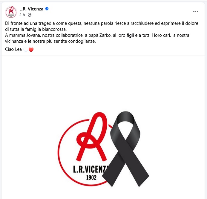 Anche i social del Lanerossi Vicenza sono stati oggi listati a lutto per la morte della piccola Lea: la mamma Jovana è infatti una collaboratrice della società. “Di fronte ad una tragedia come questa – ha scritto la società – nessuna parola riesce a racchiudere ed esprimere il dolore di tutta la famiglia biancorossa. A mamma Jovana, nostra collaboratrice, a papà Zarko, ai loro figli e a tutti i loro cari, la nostra vicinanza e le nostre più sentite condoglianze. Ciao Lea”.