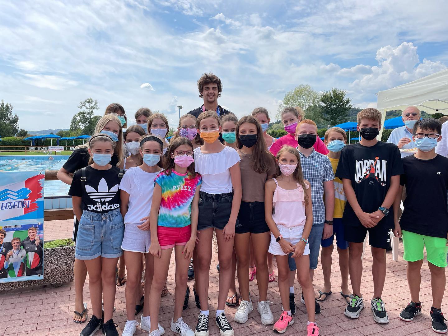 Grande gioia e festeggiamenti ieri pomeriggio per l’arrivo di Thomas Ceccon nella piscina della Leosport di Creazzo. Il nuotatore scledense che a Tokyo ha conquistato la medaglia d’argento nella staffetta 4×100 stile libero e quella di bronzo nella 4×100 misti è tornato nella sua seconda casa. “Qui mi sento a casa mia. Non mi aspettavo di trovare tutte queste persone e tutto questo calore. Sono emozioni che si vivono poche volte nella vita” ha detto Ceccon tra brindisi, foto ricordo, applausi e strette di mano.