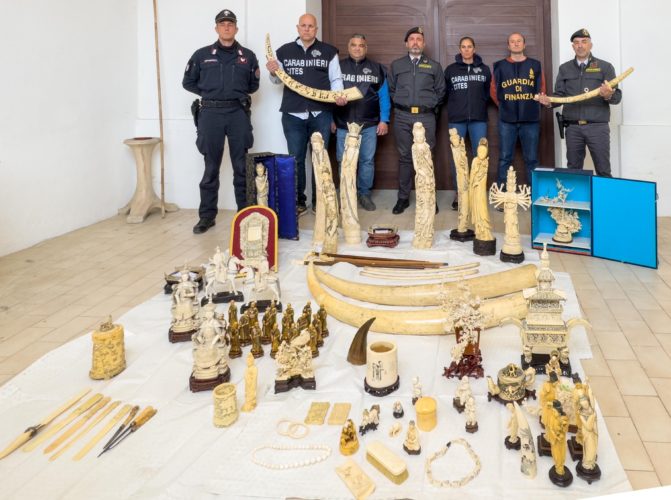 Tra i reperti, definiti dai militari “di elevato valore artistico-culturale”, figurano zanne incise con figure orientali, una katana e intagli raffiguranti animali e natura morta. Sono state rinvenute anche due zanne grezze di elefante africano (Loxodonta africana) e un corno di rinoceronte nero (Diceros bicornis), entrambi tutelati nel Regolamento europeo. La caccia di frodo agli elefanti e il traffico di avorio, trainati dalle richieste del mercato nero asiatico, si attestano ancora su livelli pericolosamente elevati, come monitorato dal programma Cites Monitoring the Illegal Killing of Elephants, che censisce la quota di abbattimenti illegali di elefanti. È per questo che l’Unione Europea applica una normativa molto stringente in questo ambito e nel dicembre del 2021 ha ulteriormente inasprito le norme sul commercio di avorio. Tra le innovazioni più significative, sono stati vietati gli scambi all’interno dell’Unione Europea, l’esportazione e l’importazione per fini commerciali, sia di avorio grezzo che di prodotti lavorati contenenti avorio.