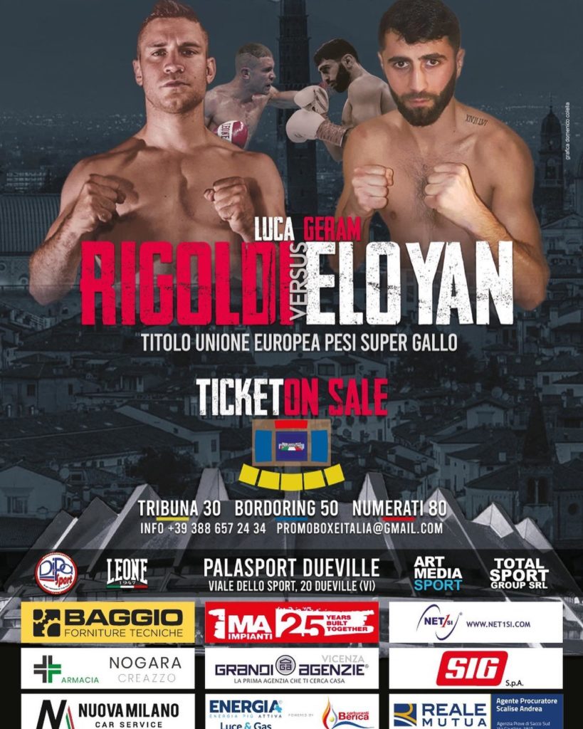 Tutto pronto per il ritorno sul ring di Luca Rigoldi, allestito – dopo i successi al Palagoldoni di Vicenza e prima al Palaromere di Schio – ancora una volta nel Vicentino con il palasport di Dueville ad ospitare venerdì 5 agosto un’inedita riunione pugilistica con un carnet di incontri assai farcito. E show assicurato per il pubblico. Piatto forte della serata è senza timore di smentita il match valido per la categoria supergallo tra il boxeur thienese (ma cresciuto a Villaverla) campione continentale in carica dopo la reconquista e lo sfidante Geram Eloyan, originario dell’Armenia e di nazionalità belga.