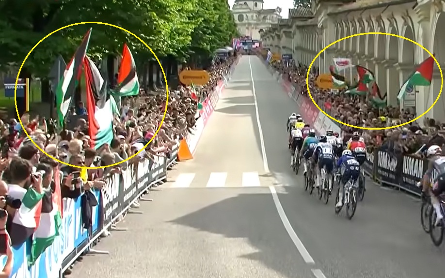 Durante la tappa attivisti hanno esposto, in diversi punti lungo il percorso e anche ai piedi della scalinata di Monte Berico, bandiere pro Palstina. L’eurodeputata Cristiana Guarda è stata addirittura identificata dal carabinieri: “Oggi, subito il dopo il passaggio del Giro d’Italia nel mio paese – ha raccontato l’eurodeputata dei Verdi – sono stata identificata dai carabinieri per aver esposto una bandiera della Palestina. Mi trovavo all’interno del campo agricolo di proprietà della mia famiglia, a Lonigo in provincia di Vicenza, e avevo appena riposto la bandiera dopo il passaggio dei ciclisti. Tutto ciò è assurdo. Perché occupare così le forze dell’ordine? Mi chiedo perché identificare chi vuole solamente mostrare solidarietà nei confronti del popolo palestinese, vittima delle atrocità del governo Netanyahu. Come parlamentare europea non posso tacere di fronte al massacro e mi sono sentita in dovere di essere presente, sulle strade del giro, con la bandiera di Palestina come tante e tanti in tutta la penisola. Il mio non è un episodio isolato: in questi giorni, è stato fatto di tutto per nascondere le manifestazioni a sostegno della Palestina sulle strade del Giro. Con scarsi risultati, visto che la bandiere sono presenti in tutte le tappe. Un bellissimo segnale, anzitutto di umanità, che non può più essere ignorato dal governo,” prosegue. “Ma ecco cos’ho imparato oggi: se volete scendere in piazza con una bandiera palestinese, non dimenticate di portare un documento d’identità” conclude.