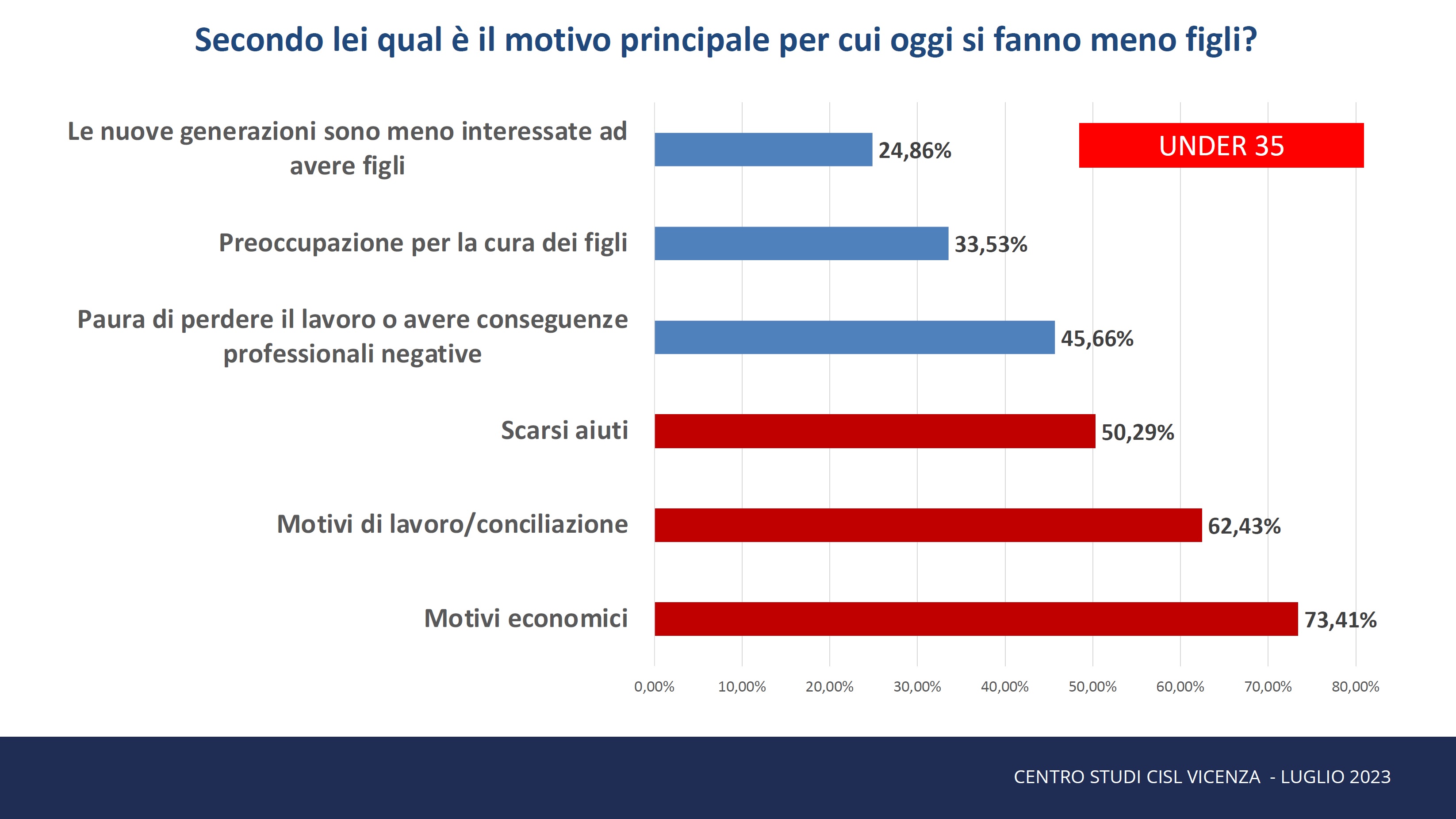 Questa classifica rimane sostanzialmente invariata (si invertono solo le ultime due voci) anche ponendo la stessa domanda agli over 35, sebbene le percentuali delle risposte risultino diverse: i motivi economici restano al primo posto ma solo per il 64% degli intervistati, seguiti da scarsità di aiuti e difficoltà di conciliare lavoro e famiglia quasi appaiati (rispettivamente, 45,9% e 45,6%); a seguire i timori per il lavoro (31,8%), un minore interesse da parte delle nuove generazioni (26,8) e una generale preoccupazione per la cura dei figli (23,8%).