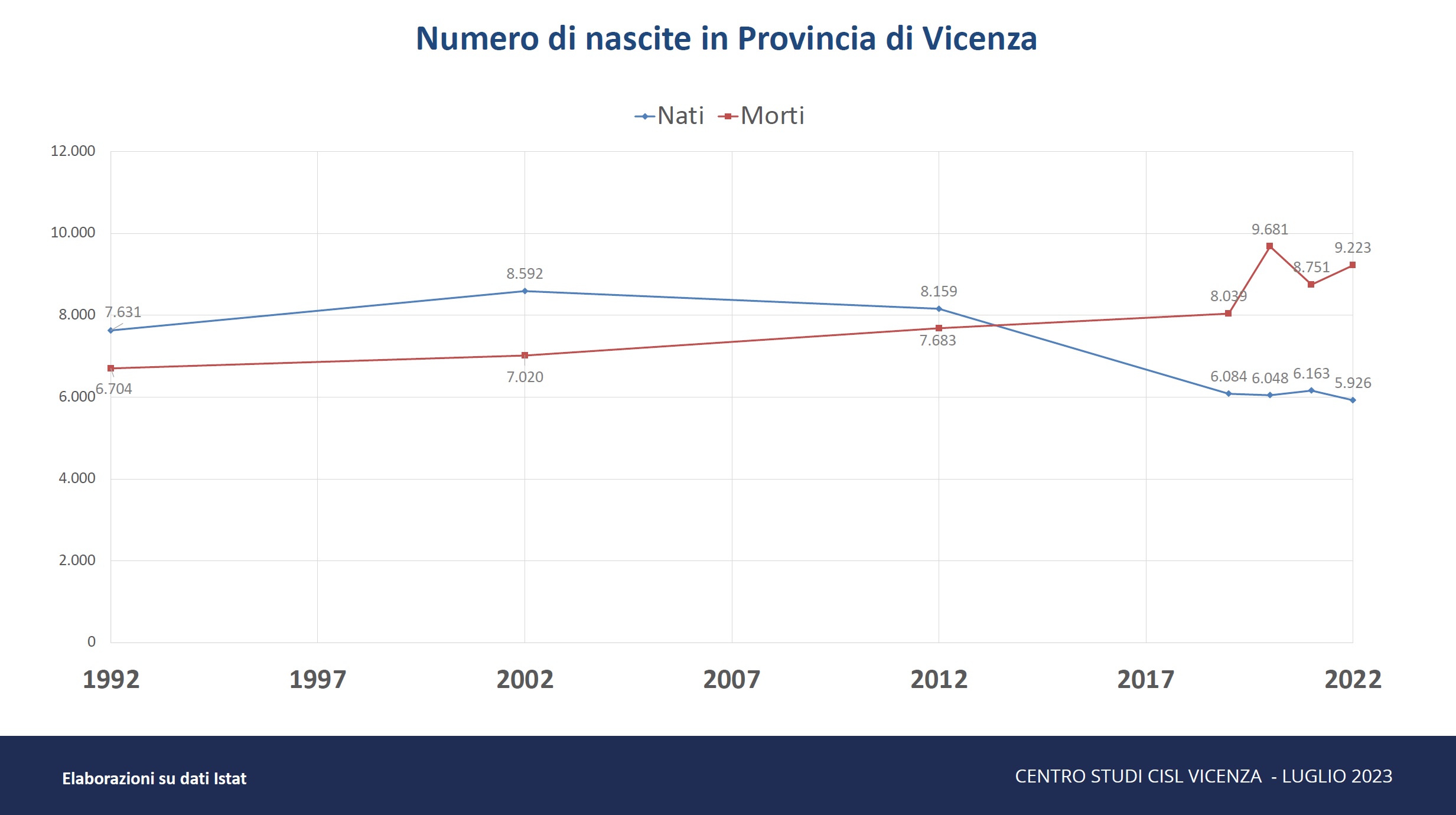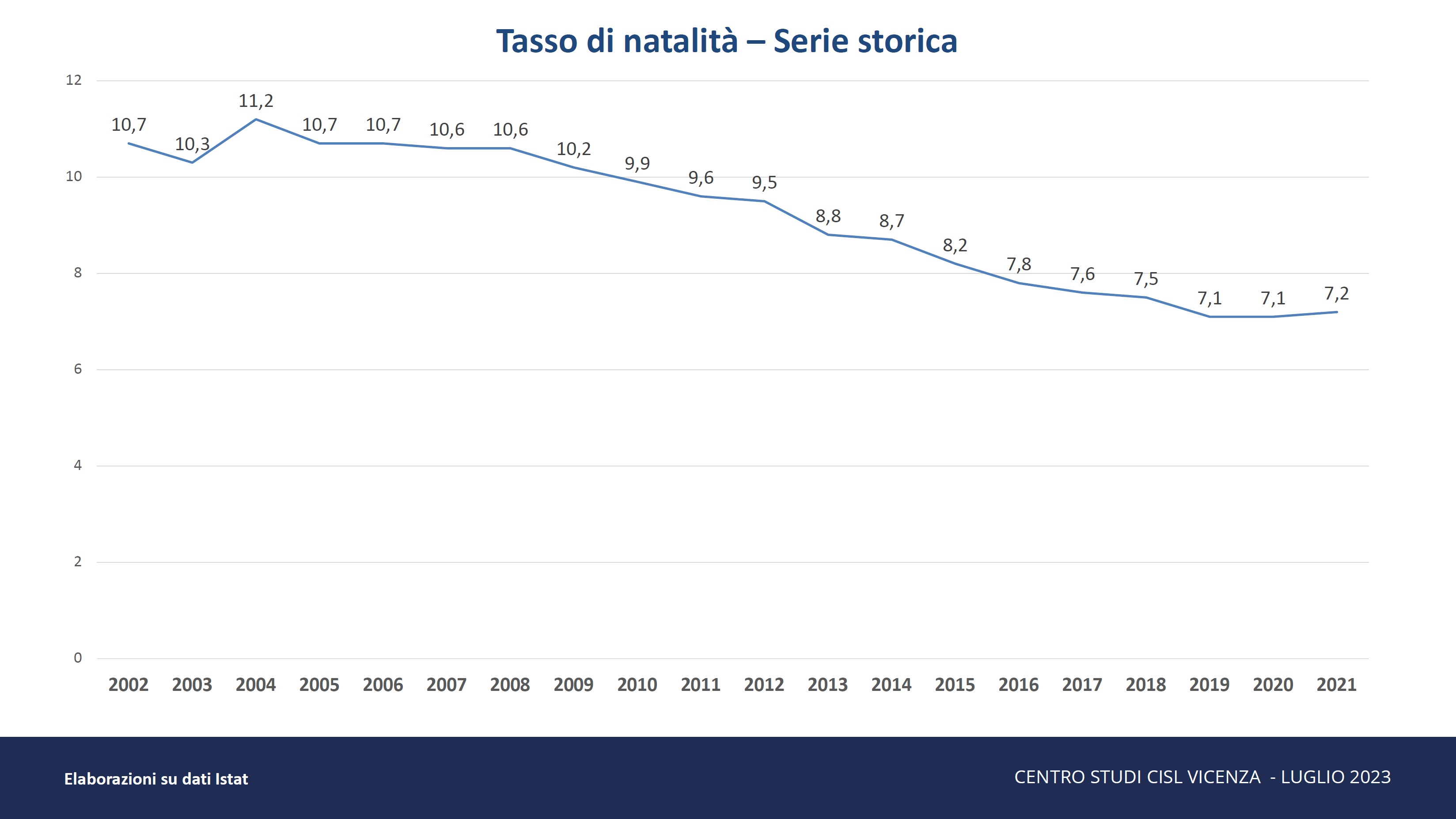 Il tutto a partire da una considerazione: il calo demografico è una realtà innegabile anche nel Vicentino, dove si è passati dagli 8.592 nati nel 2002 ai 5.926 del 2022 (-31% in soli vent’anni), con un tasso di natalità sceso da 10,7 nascite ogni 1.000 abitanti nel 2002 (con una punta di 11,2 nel 2004) a 7,2 del 2021.