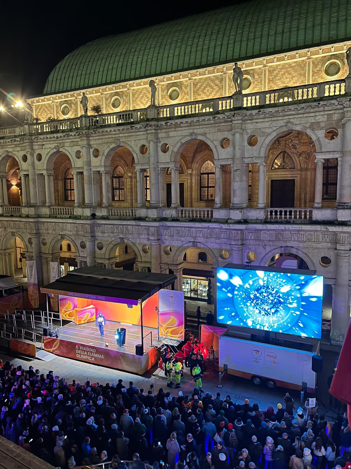 Prima dell’arrivo dei tedofori e dell’accensione del braciere, in piazza dei Signori la Tappa di Vicenza della fiamma è stata celebrata a partire dalle 17 con il villaggio “City Celebration”, allestito in pieno centro. “Questa è una terra di sport e non soltanto una città di sport – le parole del sindaco di Vicenza Giacomo Possamai – . Qui sul palco abbiamo oggi una rappresentanza di atleti ed ex atleti olimpionici che sono cittadini della città di Vicenza, ma se avessimo coinvolto tutti gli atleti della provincia di Vicenza che hanno fatto le Olimpiadi, avremmo avuto qui più di cento persone. Credo che dia l’idea di quanto questa sia una terra di sport e di quanto Vicenza e il territorio vicentino meritino che la fiaccola olimpica passi in questa piazza. Territorio, cittadino e provinciale, dove il cinquanta per cento dei nostri cittadini fa pratica sportiva. Basta questo dato per far capire quanto siano importanti queste Olimpiadi per il Veneto e perché questa terra le stia accogliendo con così grande calore. Auguro infine una buona Olimpiade a tutti gli atleti che vi parteciperanno”.