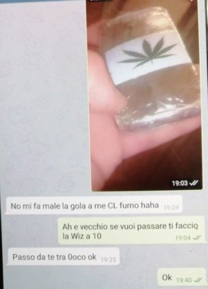 A questo punto, incrociando i dati acquisiti con le banche dati di cui dispone la guardia di finanza, è stato perquisito l’appartamento in corso Padova dove il 17enne risultava residente: qui i finanzieri hanno rinvenuto, nascosti in un comodino, due buste contenenti complessivamente oltre 150 grammi di marijuana, un bilancino di precisione, un grinder e 700 euro in contanti. Il lavoro dei militari non si è però fermato qui e, proprio per ricostruire la filiera delle cessioni della droga, hanno sequestrato ed analizzato anche lo smartphone del 17enne.
