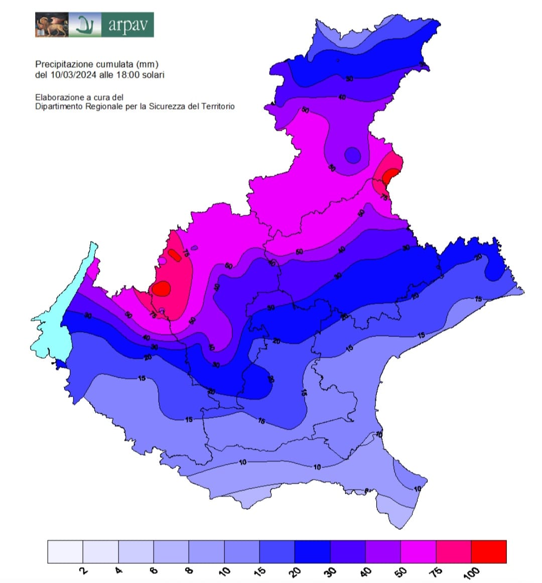 La salita veloce del Bacchiglione in serata è dipesa dal fatto che nel primo pomeriggio il passaggio di un robusto fronte freddo ha prodotto rovesci particolarmente intensi, soprattutto sui rilievi esposti che alimentano il bacino imbrifero del Bacchiglione. A Posina e a Turcati Recoaro si sono superati i 20 millimetri in un’ora tra le 14 e le 15. Questo carico pluviometrico ha indotto il forte incremento osservato in città nelle ultime due ore, che dovrebbe progressivamente rallentare.