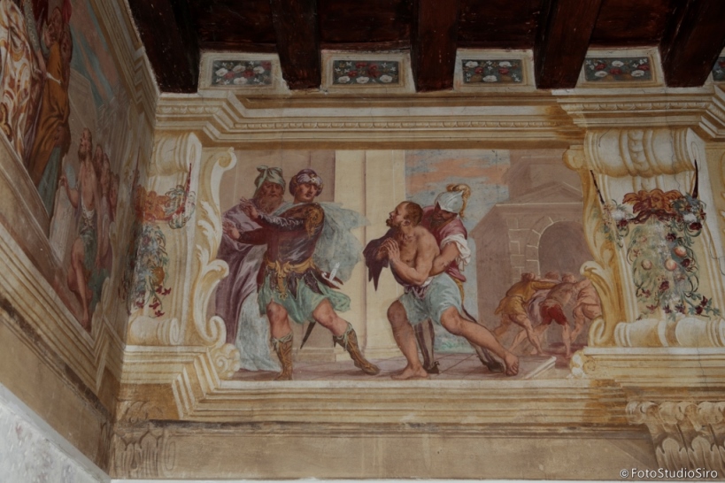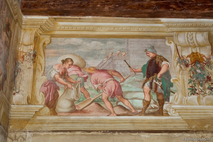 Oltrepassato uno stretto vestibolo, si accede alla Sala del fregio, un salone rettangolare che guarda sul prospetto sud della proprietà. Nella parte inferiore delle pareti di recente sono stati scoperti alcuni lacerti di una decorazione ad affresco cinquecentesca che ricorda i modi e i temi della scuola di Paolo Veronese. Se alziamo lo sguardo invece notiamo il fregio che dà il nome alla sala. La decorazione, realizzata probabilmente dal pittore vicentino Costantino Pasqualotto (1681-1755) attorno al 1730, illustra le Storie di Giuseppe ebreo, tratte dalla Bibbia, ciclo che esalta l’attività agricola rendendo evidente a livello simbolico e iconografico il ruolo dei committenti. Infatti il fregio trova collocazione in corrispondenza della sopraelevazione settecentesca dell’edificio, un ampliamento cospicuo che ha creato gli ampi granai che a quel tempo permisero alla famiglia Valmarana, sempre attenta alle esigenze della tenuta, di incrementare significativamente la cubatura dell’edificio, e di mettere a disposizione delle attività agricole spazi idonei allo stoccaggio dei prodotti della terra.