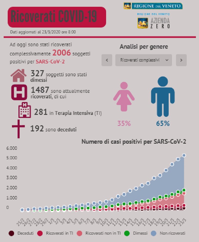 Salgono a 5.505 i casi di positività registrati stamani in Veneto, con un aumento di 233 rispetto al pomeriggio di ieri. Lo riferisce la Regione con il consueto bollettino dell’Azienda Zero delle ore 8. I decessi salgono a 192, 6 in più rispetto a ieri pomeriggio. Le persone in isolamento (positivi più i loro contatti) sono 15.376. I ricoverati complessivamente sono 1.533 (+36), quelli in terapia intensiva sono 281 (+13); le persone dimesse sono 327.