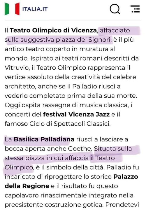 Fra le proposte di visita della città, con il racconto di monumenti ricchi di storia e le ville palladiane piene di arte, spicca infatti la descrizione di due dei luoghi principali che un turista cerca quando arriva in città: lo splendido Teatro Olimpico diventa così “affacciato sulla suggestiva piazza dei Signori”, mentre la Basilica Palladiana risulta “situata sulla stessa piazza in cui affaccia il Teatro Olimpico”. Vicini vicini, insomma: sei in piazza e li hai lì entrambi.