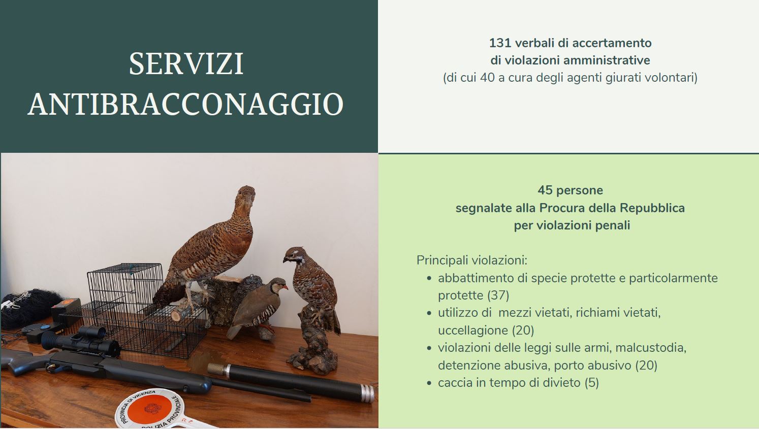 Tutela del territorio a 360 gradi, dunque, con 1.737 missioni di recupero di fauna selvatica (salvando oltre 900 animali da morte certa) e 45 segnalazioni della presenza di bracconieri (40% in più rispetto al 2022), giusto per dare una prima idea della portata ampia delle azioni “sul campo” degli agenti, che non si limitano all’antibracconaggio ma che impiegano risorse importanti, ad esempio, sul fronte dei necessari ai “prelievi” autorizzati di specie ritenute dannose per l’ecosistema se la loro proliferazione rimane incontrollata: colombi, corvidi, cinghiali (oltre 1.300) e nutrie, sull’ordine delle 15 mila unità nell’anno in oggetto.