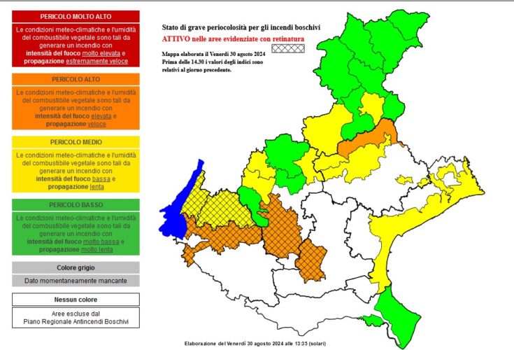 La Protezione Civile del Veneto ha comunicato che, viste le condizioni meteo-climatiche e vegetazionali, è stato estesa in data oggi, 30 agosto, la dichiarazione dello stato di grave pericolosità per gli incendi boschivi per i territori comunali a rischio della provincia di Vicenza. La provincia berica si aggiunge così ai territori delle province di Padova e Verona nei quali il rischio resta confermato, dopo dichiarazione del 13 agosto scorso.