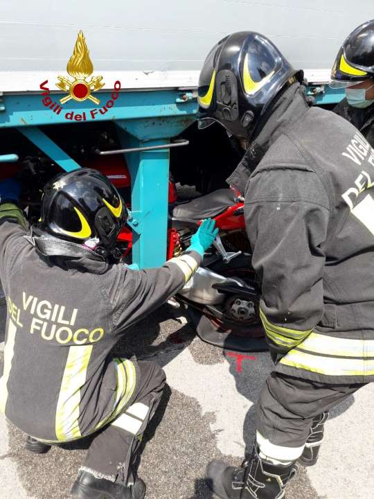 Ad avere la peggio, quindi, è stato un motociclista, per il quale è stata dichiarata la morte sul colpo, senza possibilità alcuna di intervenire con le manovre di rianimazione. La sua Ducati 849 e lui stesso sono rimasti incastrati sotto il rimorchio dell’autotreno Volvo: una trappola senza via d’uscita.