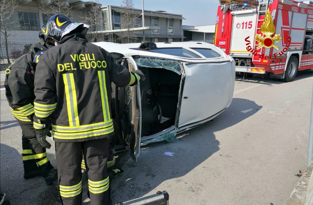 L’incidente è avvenuto alle 13:10 in via della Tecnica, all’incrocio con via dell’Economia: una delle due auto è finita rovesciata su un fianco.