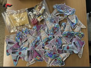 Dal parco le indagini si sono spostare a casa del 23enne dove i militari hanno rinvenuto 31 bustine a forma di gelato contenenti circa 93 grammi di marijuana già pronte per la vendita, diversi pezzi di hashish, bilancini di precisione, un trituratore e 39 buste vuote con la stessa grafica, pronte per essere riempite.